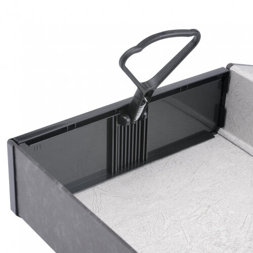 Press-Button Open-Close Mechanism These 5 Star Box Files (Material: Pressboard; Size: Foolscap; Spine: 75 mm; Capacity: Approx. 750 sheets; Colour: Cloudy Grey; Pack Size: 10; Ref: 297501) feature strong press-button open-close mecahnism. |
