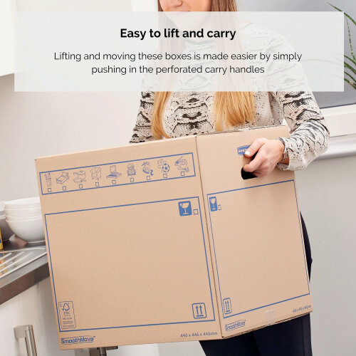 Made from strong, double thickness corrugated board, these Bankers Box SmoothMove standard storage boxes come with convenient pre-printed icons and large label areas for quick identification of contents. The boxes also feature optional perforated carry handles that can be used if required. The boxes do require tape for assembly and closure. Each box measures 350 x 350 x 550mm (internal). This pack contains 10 brown storage boxes.
