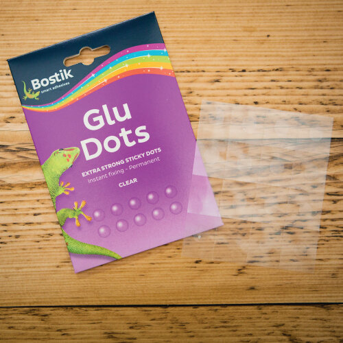 Bostik Extra Strong Glu Dots are circles of clear, extra strong glue which sticks to almost any flat surface. Suitable for use on paper, wood, plastic, metal glass and painted surfaces, these glu dots are ideal for gift wrapping, photo albums, craft projects and instant fixing. Made from an acid and lignin free formula, the non-yellowing dots have a diameter of approximately 10mm.