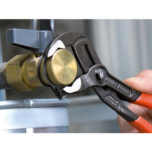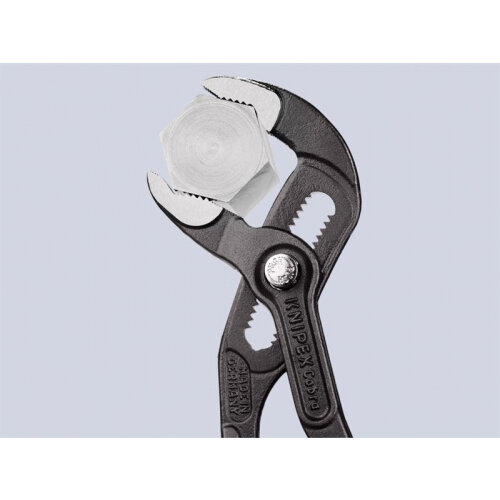 The Knipex 87 01 Cobra® Series Water Pump Pliers are made from chrome vanadium electric steel, which has been forged and multi-stage oil-hardened for excellent durability. The gripping surfaces have special hardened teeth, with hardness approx. 61 HRC to ensure high wear resistance and stable gripping. A press-button action allows fast and firm adjustment directly on the workpiece.