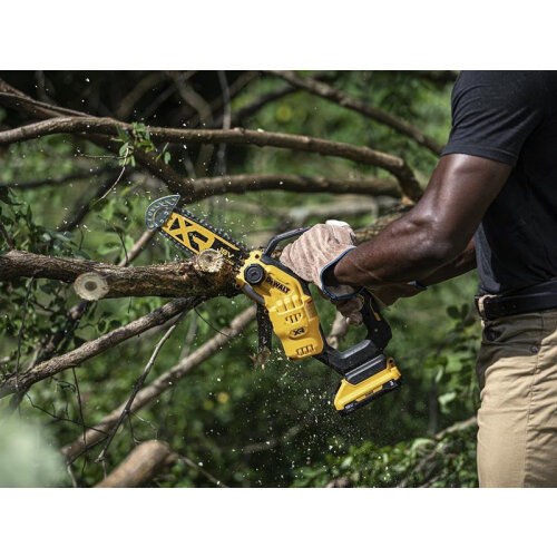 DEWALT DCMPS520 XR Pruning Saw with a powerful brushless motor giving higher performance, compact size and extended service life. Automatic oiling reduces maintenance requirements. Its two handles with additional hand protection increase user safety whilst providing better control of the saw. Other features include a safety switch-on lock, metal guard to reduce kick-back against hitting fences or walls plus the guard protects the chain from an ingress of dirt.