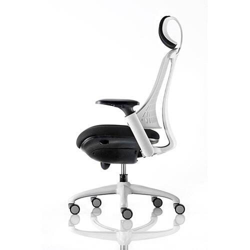 Material & Colour Unique Black flexible mesh backrest with black fabric seat and white Frame Large cushioned seat with waterfall front |