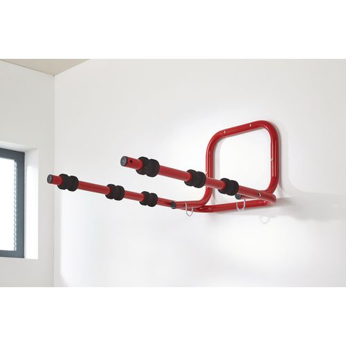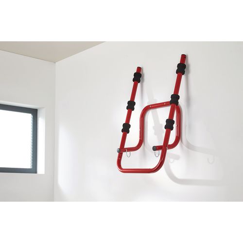 Helps store bikes where space is limited. Bicycle protected from damage by heavy duty foam pads. Colour - red. Easy to install (fixings not supplied). 4 cycle version features telescopic arm.