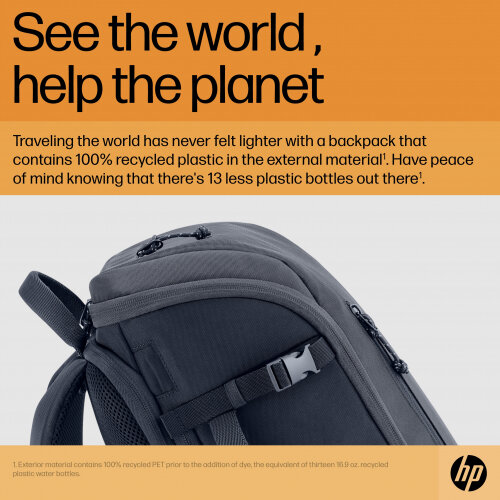 - Traveling the world has never felt lighter with a backpack that contains 100% recycled plastic in the external material<sup>[2]</sup>. Have peace of mind knowing that there's 13 less plastic bottles out there<sup>[2]</sup>.