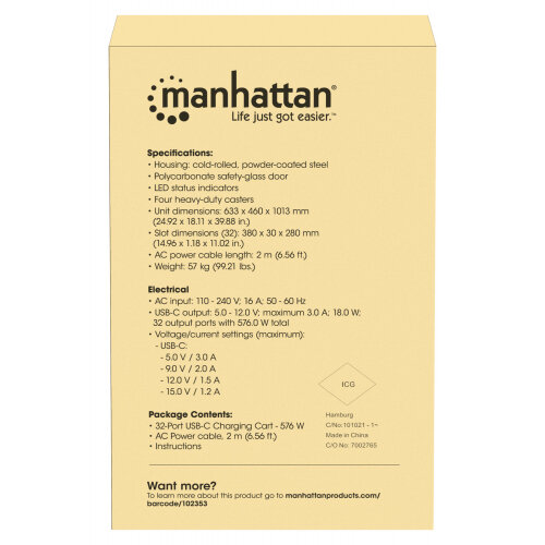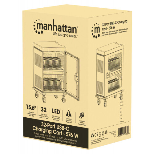 - Manhattan Charging Cabinet/Cart via USB-C x32 Devices, Trolley, Power Delivery 18W per port (576W total), Suitable for iPads/other tablets/chromebooks up to 15.6 Inches, Bays 380x30x280mm, Device charging cables not included, Lockable (PIN code), EU & UK