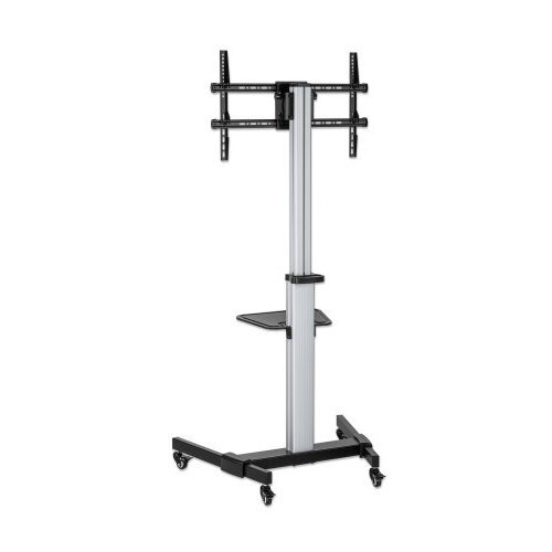 Manhattan TV & Monitor Mount, Trolley Stand, 1 screen, Screen Sizes: 37-86", -10 to 5° Tilt, 90° Rotation, Silver/Black, VESA 200x200 to 600x400mm, Max 50kg, Height adjustable 1200 to 1600mm, AV/Laptop shelf, Aluminium, LFD, Lifetime Warranty