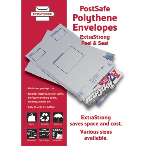 Brand Supplied by Postsafe - Postsafe manufacture a comprehensive range of polythene envelopes and polythene bags in opaque, clear and padded polythene. All products are strong, recyclable, waterproof and tear resistance. Postsafe polythene envelopes are manufactured to the highest quality standards in the UK. PostSafe has factory in Broadstairs, Kent. UK.