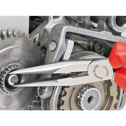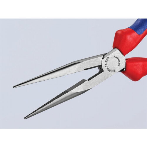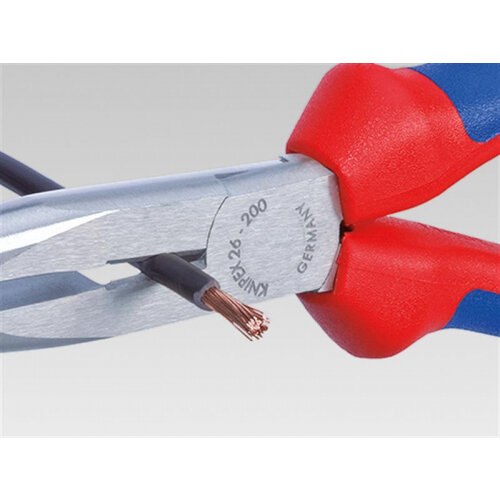 These Knipex 26 Series Snipe Nose Side Cutters (Stork Beak) have long flat round jaws. Highly loadable, elastic precision points with blades. Cutting edges separately induction hardened. Made from special tool steel, oil-hardened. 61HRC.