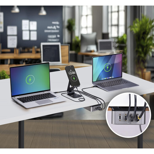 Developed with feedback from enterprise clients, this charger addresses common workspace challenges like limited wall outlets and messy cable setups. It's an ideal solution for meeting rooms, shared workspaces, hybrid offices, and educational environments.