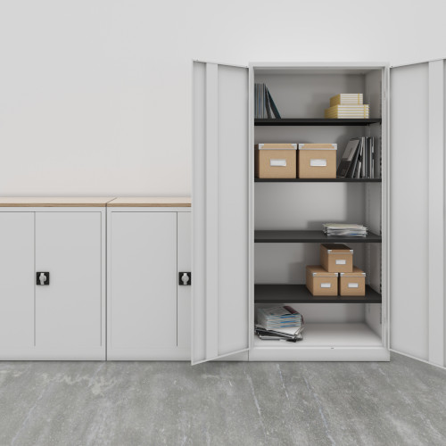 - A flexible alternative to wooden storage, this steel double door cupboard includes 4 shelves