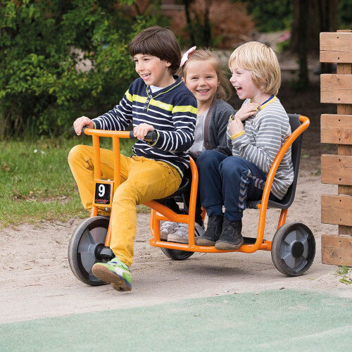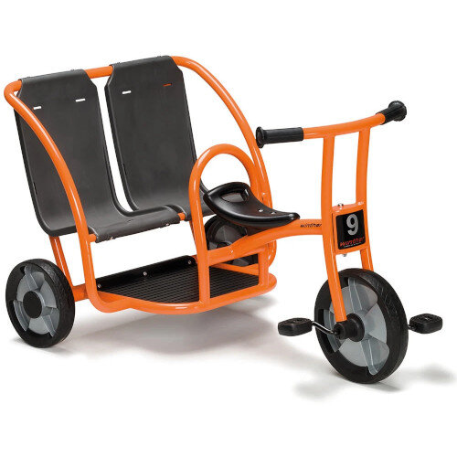 this sturdy, fun trike. Encourage them to take turns driving each other.